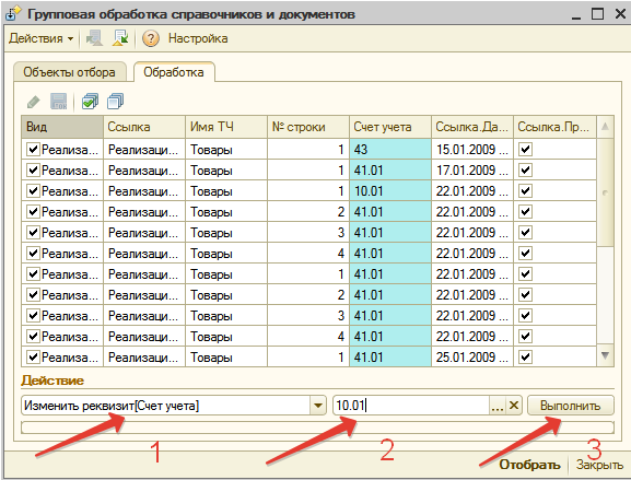 Пример 3. В конфигурации "Бухгалтерия предприятия" редакция 2.0. Необходимо во всех документах «Реализация товаров и услуг» за 2009 год, в табличной части «Товары» поменять счета учета номенклатуры на «10.01».