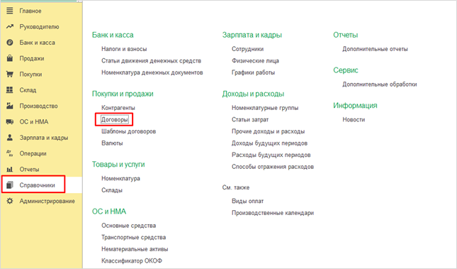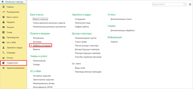 Для того, чтобы настроить или создать шаблоны договоров, необходимо открыть раздел «Справочники» - «Шаблоны договоров».