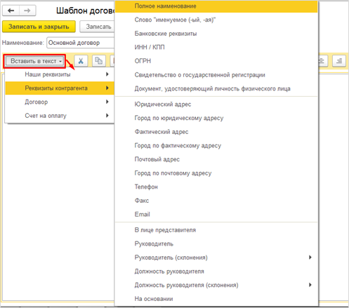 При создании нового шаблона необходимо указать, каким будет наименование этого шаблона, далее приступить к заполнению текста шаблона. Для удобства пользователей, помимо ввода текста, доступна возможность сделать ссылки на некоторые элементы информационной базы, настраивается это через кнопку «Вставить в текст» и задается определенный параметр, который выделяется фигурными скобками, цветом и жирным шрифтом. При формировании печатной формы договора фигурные скобки будут замены на соответствующие данные. В примере по созданию нового шаблона использовался такой параметр как «Полное наименование контрагента».