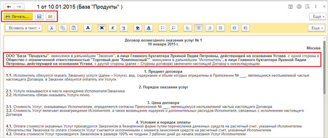 Организация взаимодействует с покупателями или поставщиками на основании заключенного договора. В связи с этим может появиться необходимость распечатать договор. Бывает даже, что требуется готовить и распечатывать однотипные договоры, изменяя только информацию по контрагентам. В программе 1С предусмотрена возможность формирования текста договоров, а также распечатка, отправка по электронной почте и сохранение в файл.