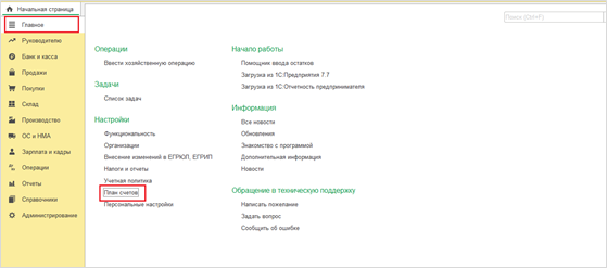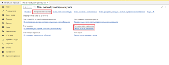 Для того, чтобы включить ведение сводного учета или учет расчетов по каждому работник, необходимо перейти в раздел «Главное» - «План счетов»