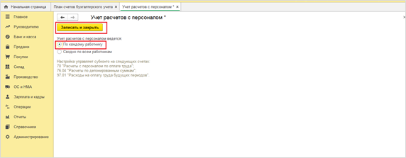 Далее перейти по ссылке «Настройка плана счетов» и открыть «Учет расчетов с персоналом», после этого выбрать одно из значений по ведению учета расчетов с персоналом: «По каждому работнику» или «Сводно по всем работникам» и нажать на кнопку «Записать и закрыть». Установленная настройка будет распространяться на все организации, которые созданы в данной информационной базе.