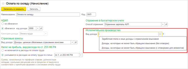 В открывшемся окне в соответствующем виде начисления появилось поле «Вид дохода», которое требуется заполнить. После того, как изменения будут записаны, «Вид дохода» будет заполняться автоматически.