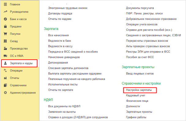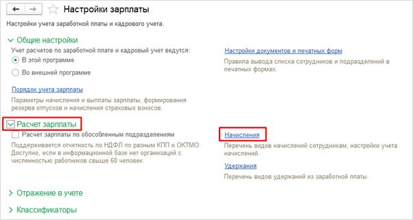 Для того, чтобы настроить автоматическое заполнение «Вида дохода» в документе «Ведомость в банк», необходимо перейти в раздел «Зарплата и кадры», далее «Настройки зарплаты» и «Расчет зарплаты», выбрать ссылку «Начисления».