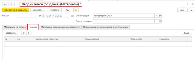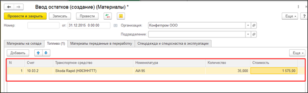 В открывшемся окне перейти на закладку «Топливо», выбрать счет 10.03.2 и заполнить табличную часть документа соответствующими данными.