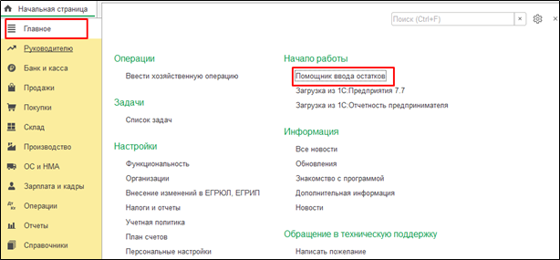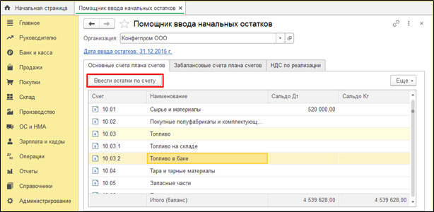 Для того, чтобы ввести начальные остатки по счету 10.03.2 необходимо открыть раздел «Главное», далее «Помощник ввод начальных остатков», выбрать счет и нажать на кнопку « Ввести остатки по счету».