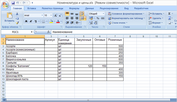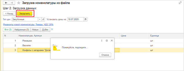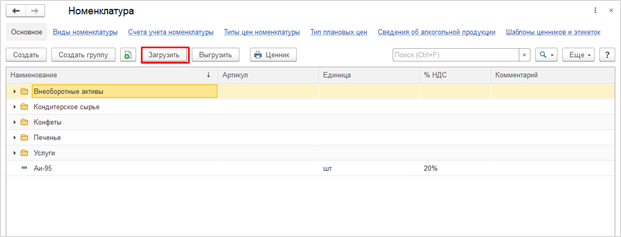 В открывшемся окне найти кнопку «Загрузить» и выбрать файл в формате Excel, который содержит в себе данные о номенклатуре.
