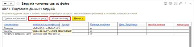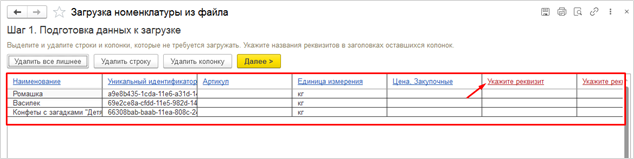 Далее сформировалась форма «Загрузка номенклатуры из файла», в которой нужно сопоставить реквизиты, указанные в файле Excel с параметрами, задаваемые для справочника «Номенклатура». Если наименование некоторых колонок выделено красным шрифтом и написано «Укажите реквизит», то в этом случае данные поля нужно установить вручную, нажав на них и выбрать из списка подходящий вариант из предложенного списка. Колонка «Единица измерения» должна определяться автоматически, если соответствует сокращенному наименованию из «Классификатора единиц измерения».