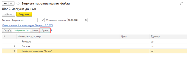 Если некоторые позиции выделены знаком "!", то это говорит о том, что существуют элементы с одинаковыми реквизитами в справочнике "Номенклатура", и для исправления данной ситуации необходимо перейти на закладку «Дубли» и подобрать требуемые элементы.