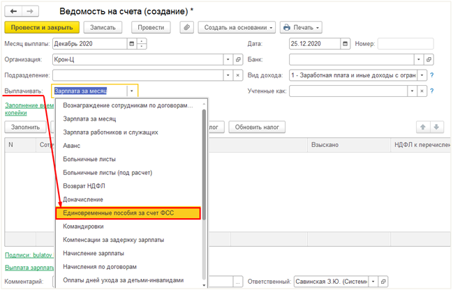 После корректного заполнения и проведения документа формируем документ "Ведомость на счета" и выбираем соответствующий вид выплаты "Единовременные пособия за счет ФСС".