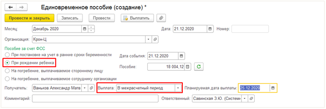 В созданном документе зададим условие, что начисление пособия будет связано с рождением ребенка и укажем, что выплата будет производиться в межрасчетный период.