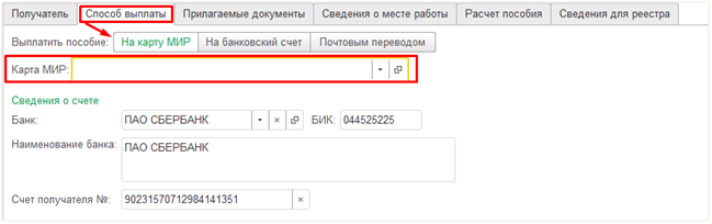 После исправления суммы к выплате на сумму пособия и добавления ее в документ необходимо очистить поле "НДФЛ" и задать вручную банковский счет, принадлежащий платежной системе «Мир».