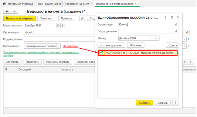 После чего требуется отметить флажком конкретный документ начисления "Единовременного пособия за счет ФСС".