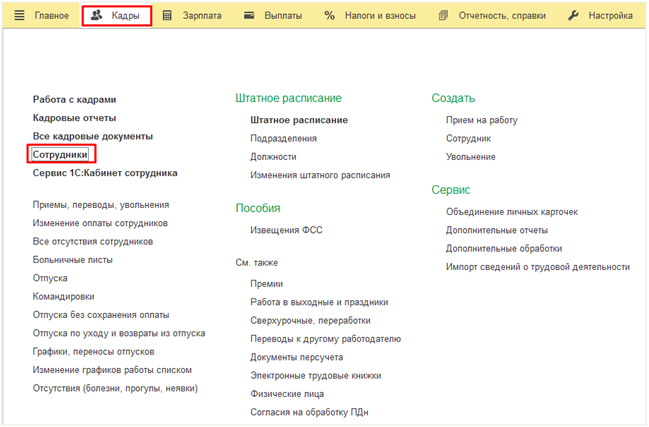 В случае, если, сотрудница находится в отпуске по уходу за ребенком и ей предусмотрено получение только Пособия по уходу за ребенком, то логично настроить выплату на карту «Мир» в качестве способа выплаты. Выполнить соответствующие настройки можно в разделе «Кадры» - «Сотрудники».