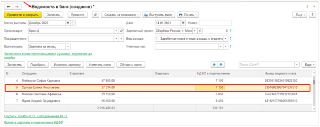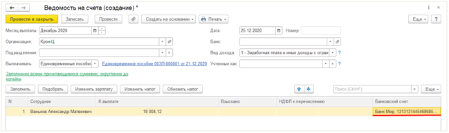 Документ "Ведомость на счета" заполнился требуемой информацией, осталось только заполнить поле «Банковский счет», к которому привязана карта «Мир».