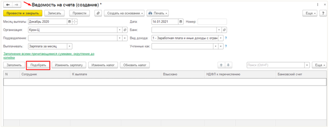 1. В первую очередь необходимо создать "Ведомость на счета" по виду выплаты "Зарплата за месяц", в которой вручную по кнопке «Подбор» будет выбрана сотрудница.