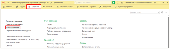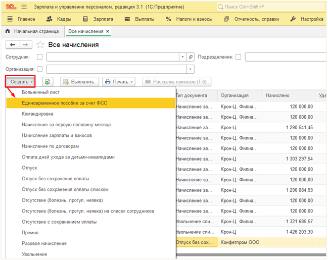 В первую очередь сформируем документ "Единовременное пособие за счет ФСС" из раздела «Зарплата», выбираем «Все начисления» — «Создать».