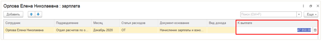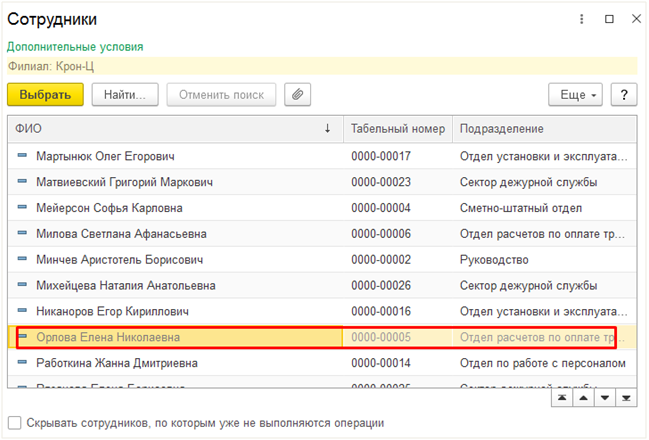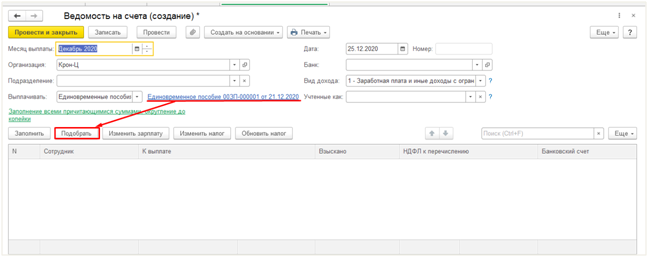 Так как автоматического заполнения суммы по документу не будет, необходимо по кнопке "Подобрать" выбрать сотрудника из списка.
