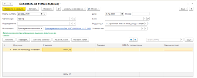 После корректного заполнения и проведения документа формируем документ "Ведомость на счета" и выбираем соответствующий вид выплаты "Единовременные пособия за счет ФСС".