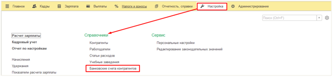 Для того, чтобы отразить выплаты пособий на карту «Мир» в рамках зачетной системы и без зарплатного проекта, необходимо заполнить банковские реквизиты сотрудников в разделе «Настройка», далее «Справочники» и выбрать «Банковские счета контрагентов».
