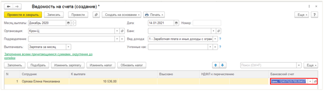 Документ "Ведомость на счета" заполнился требуемой информацией, осталось только заполнить поле «Банковский счет», к которому привязана карта «Мир».