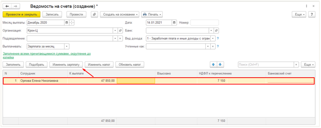 В результате в документ попадет полная сумма к выплате. Используя кнопку «Изменить зарплату» будет скорректирована сумма таким образом, чтобы осталась только сумма пособия.
