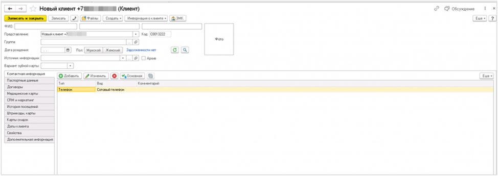 На основании открывшихся данных можно создать и заполнить карточку нового клиента.