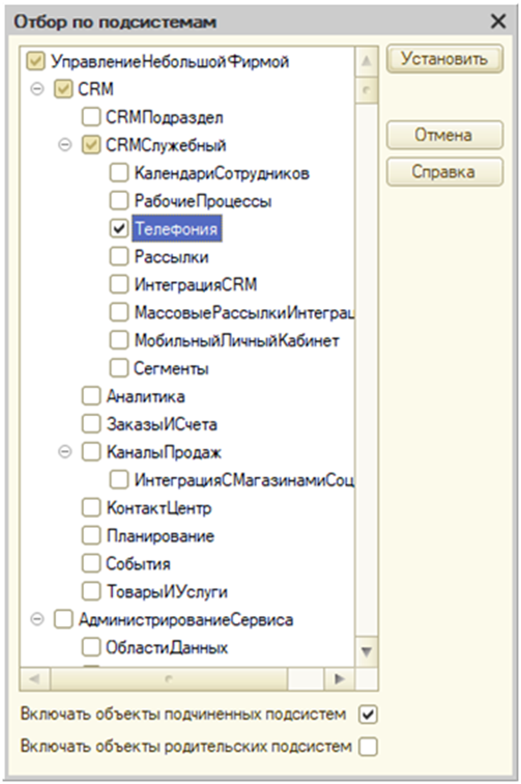 Настройки интеграции начнем с сохранения в файл конфигурации 1С Управление нашей фирмой с последующим запуском объединения с базой-приемником по подсистеме «Телефония». Для выполнения объединения нужно будет установить отметки объектов по подсистемам из файла.