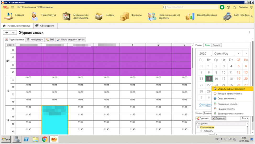 Если звонок поступает от уже зарегистрированного в системе клиента, то оповещения о звонке выходит с другим набором действий. В данном окне представлена возможность открыть расписание клиента (как существующие записи, так и сделать новую запись), а также продажи клиенту (отчет, отражающий посещения и услуги, предоставленные звонящему пациенту).