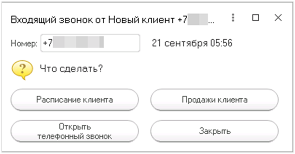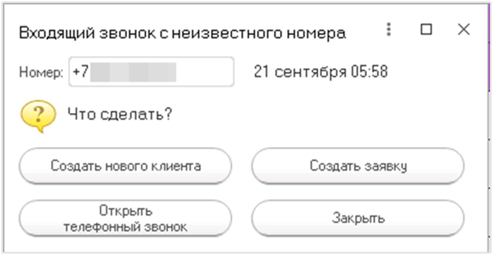 Система ожидает звонков от клиентов. При поступлении звонка с неизвестного (не зарегистрированного в конфигурации номера), у пользователя на экране выводится следующее окно оповещения.