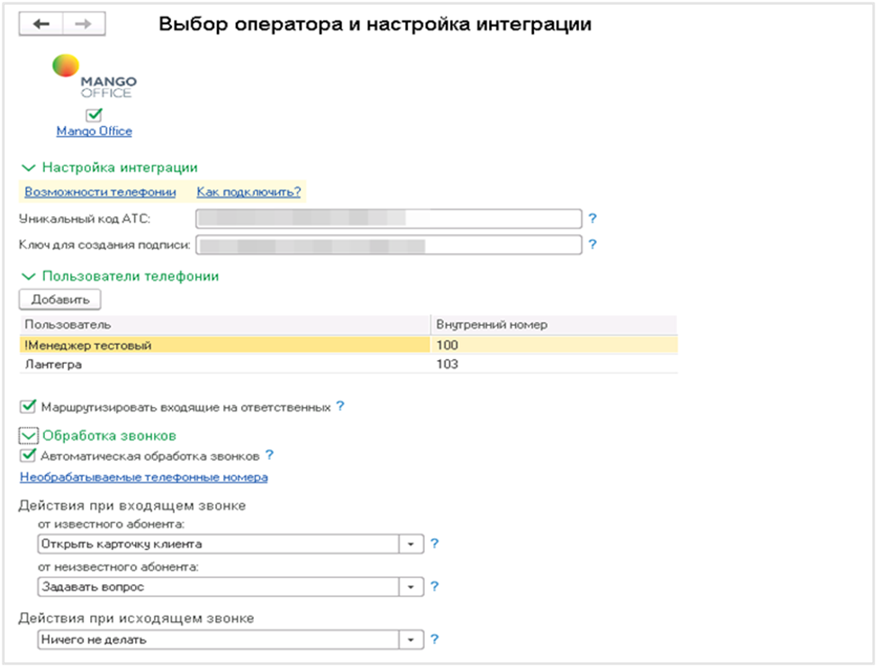 Заполнение настроек пользователей телефонии обязательно для соединения с облачной АТС. Данные о пользователях в 1С:УНФ должны соответствовать данным, указанным в личном кабинете оператора.Чтобы входящие звонки клиентов сразу перенаправлялись ответственному за абонента сотруднику, установите в настройках пользователей телефонии флажок Маршрутизировать входящие на ответственных.