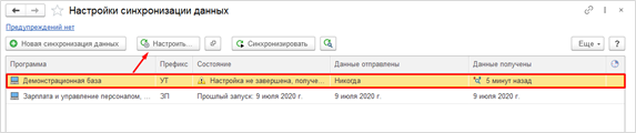 Все этапы настройки синхронизации в программе «Управление торговлей» выполнены. Переходим в программу Бухгалтерия, открываем раздел «Администрирование» - «Синхронизация данных» - «Настройка синхронизации данных». Настройка обмена создалась автоматически, осталось только выполнить этапы настройки, нажав на кнопку «Настроить».