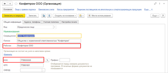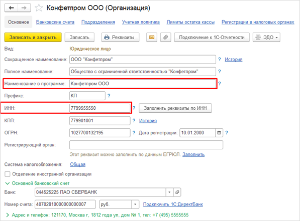 Открыв реквизиты организации, необходимо проверить, соответствуют ли «Наименование в программе» в бухгалтерской программе и «Рабочее наименование» в «Управлении торговлей», а также идентичность ИНН.