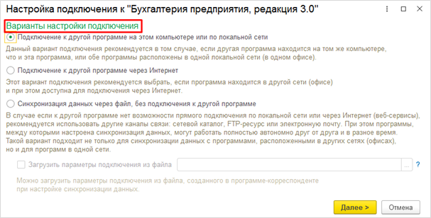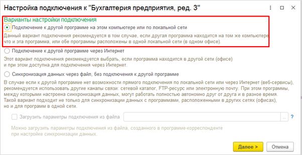 - Подключение к другой программе на этом компьютере или по локальной сети. Его особенность заключается в том, что базы должны быть расположены на одном компьютере и в этом случае обмен можно запускать со стороны одной базы, этого будет достаточно для выгрузки и загрузки данных из двух программ.