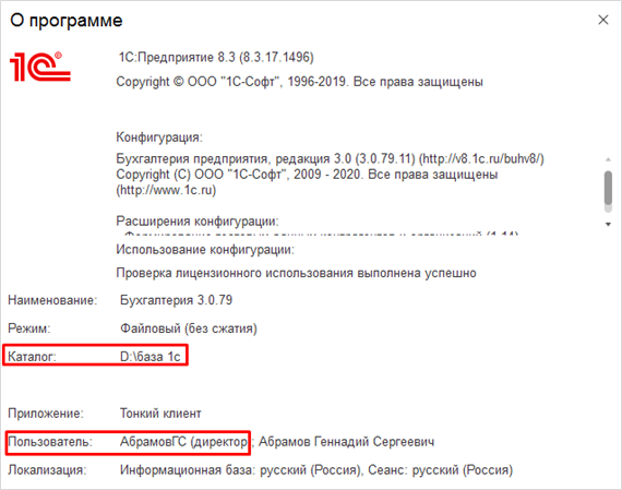 Далее следует перейти в бухгалтерскую базу и открыть справку о программе (верхний правый угол). В открывшемся окне скопировать информацию о каталоге и пользователе и заполнить этими данными соответствующие поля в программе Управление торговлей, при наличии пароля у пользователя, также его ввести и нажать на кнопку «Далее».