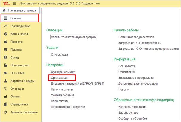 В программе «1С Бухгалтерия предприятия» ознакомиться с информацией об организации можно из «Главное» – «Организации» либо «Реквизиты организации».