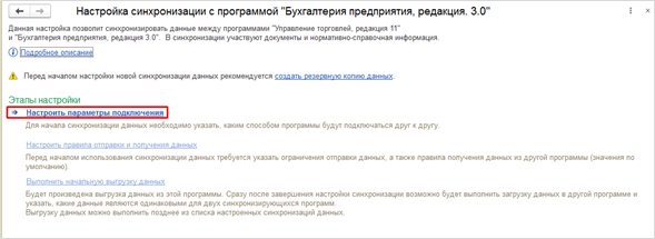 Все этапы настройки синхронизации в программе «Управление торговлей» выполнены. Переходим в программу Бухгалтерия, открываем раздел «Администрирование» - «Синхронизация данных» - «Настройка синхронизации данных». Настройка обмена создалась автоматически, осталось только выполнить этапы настройки, нажав на кнопку «Настроить».