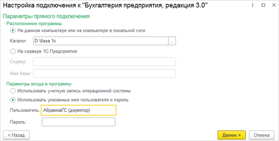 Если программа находится на сервере, то следует использовать вариант подключения «На сервере 1С: Предприятия» и задать параметры имени базы и сервера.