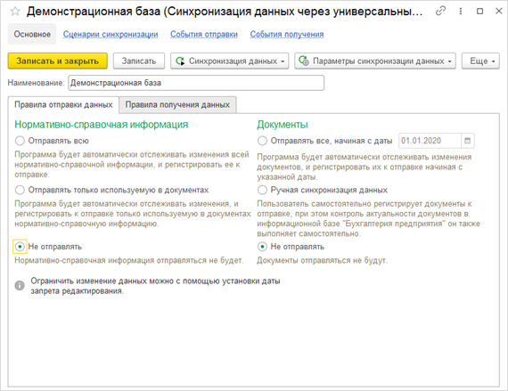 - Не отправлять. В случае установки такой настройки справочники регистрироваться и выгружаться не будут.