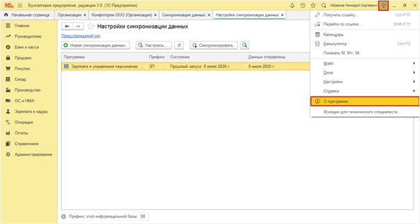 Для того, чтобы установить префикс в программе «Бухгалтерия предприятия, редакция 3.0» необходимо перейти в раздел «Администрирование»- «Синхронизация данных», далее «Префикс этой информационной базы». Здесь же ставим отметку «Синхронизация данных с другими программами».