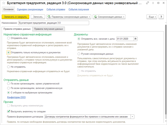 Так как предполагается односторонний обмен, то есть, со стороны «1С: Бухгалтерия предприятия» никакие данные грузиться в торговую программу не будут, то нужно установить вариант «Не отправлять» и в блоке нормативно-справочной информации, и в блоке документов.