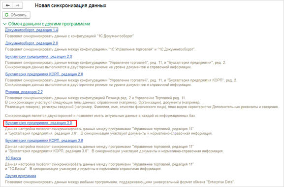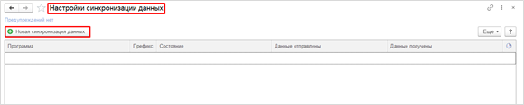 Для настройки синхронизации данных следует перейти по ссылке «Настройки синхронизации данных». В открывшемся окне следует нажать на кнопку «Новая синхронизация данных» и выбрать вариант «Бухгалтерия предприятия, ред. 3».