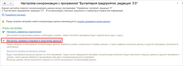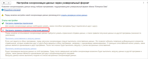 После выполненных действий настройки подключения в этой программе будут сохранены. Далее переходим к следующему доступному этапу настройки это «Настроить правила отправки и получения данных», где необходимо параметры обмена.