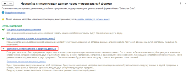 В открывшемся окне необходимо перейти по ссылке "Настроить параметры подключения" и проверьте подключение к другой базе. После этого переходим к выполнению следующего этапа «Настроить правила отправки и получения данных»При запуске этапа «Выполнить сопоставление и загрузку данных» должно открыться окно «Сопоставление данных». Если данные в обеих программах указаны идентично, то в колонке «Осталось» будет пусто. Это значит, что данные в базах успешно сопоставились автоматически, можно установить флажок «Закончить сопоставление данных».