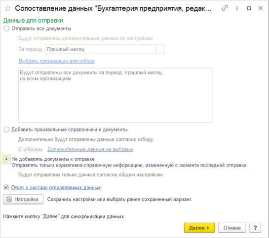 Если выгрузка из бухгалтерской программы все же предполагается, то необходимо установить соответствующие настройки по НСИ и документам. Для настройки синхронизации со стороны программы «Бухгалтерия предприятия» также предусмотрена выгрузка как всех документов и справочников, так и выборочных. Состав документов и справочников тот же самый.