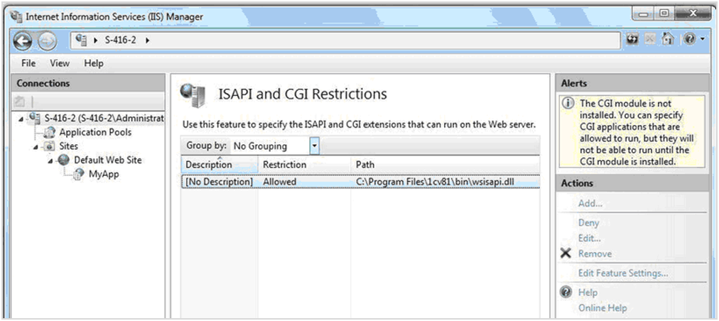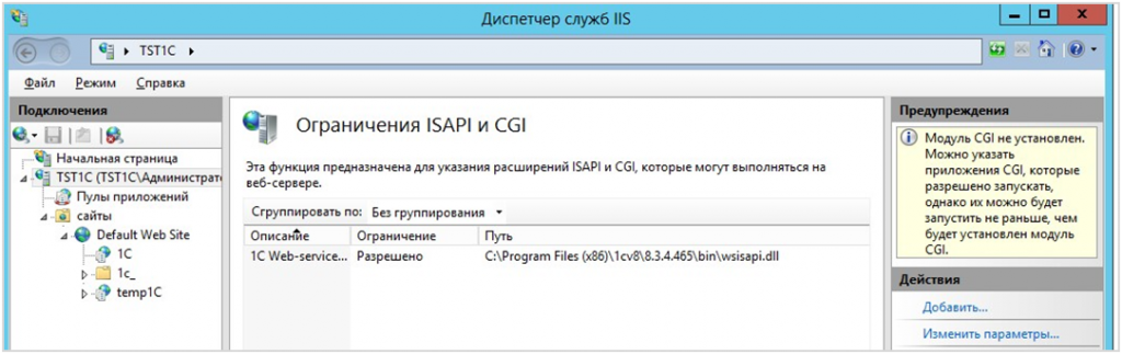 10) На вкладке «ISAPI and CGI Restrictions» доступна проверка на факт наличия обработчика web-сервисов 1С.