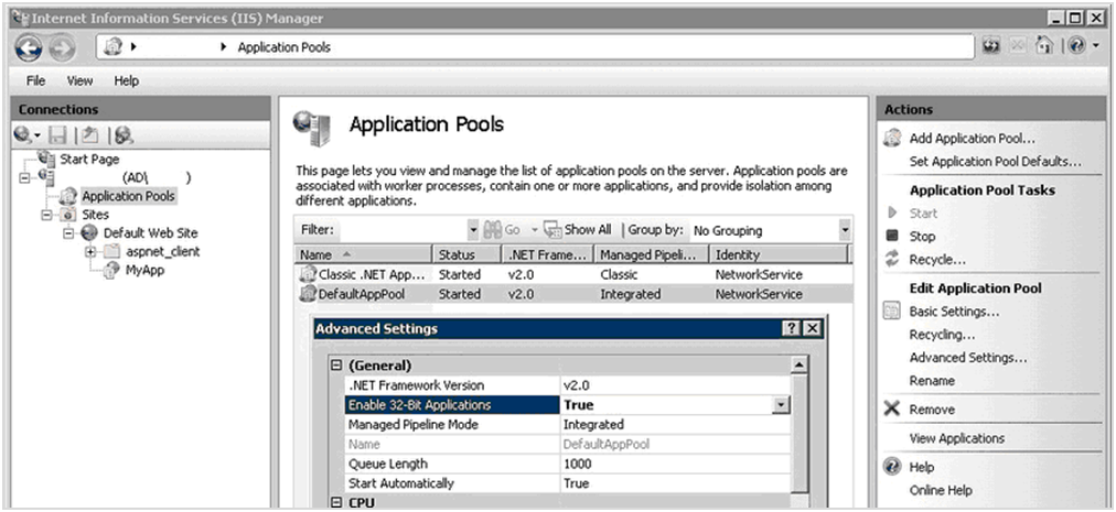 При условии 64-разрядного окружения, для обработчика потребуется включить режим Пулы приложений и выбрать «DefaultAppPool», после чего откроется окно «Дополнительные параметры» для строки «Разрешены 32-разрядные приложения» задать значение «True».