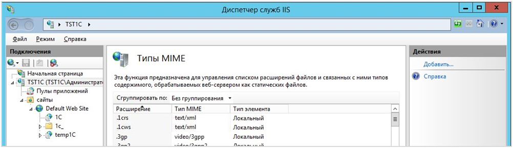 7) Затем необходимо выполнить добавление MIME типы 1С для сервера для сайта или для папки.
