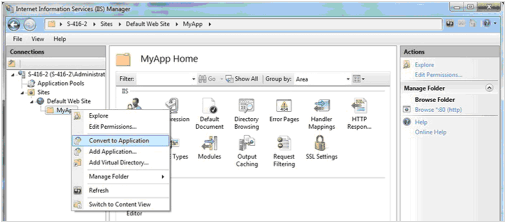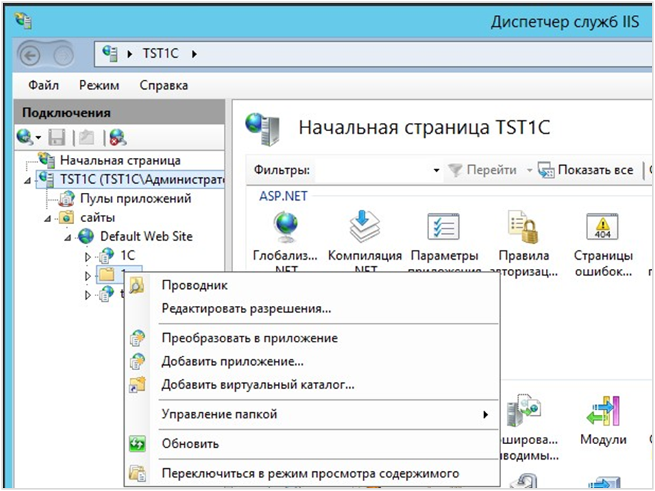 6) Переходим в консоль IIS, нажимаем правой кнопкой мыши на строку с ранее созданной нами папкой и в открывшемся окне выбираем строку «Преобразование в приложение».
