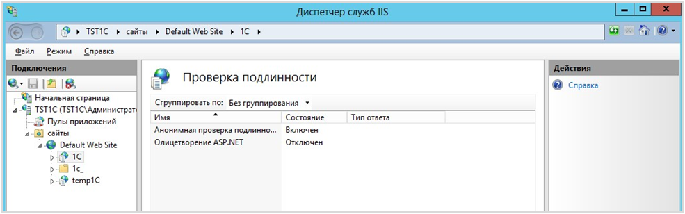 12) Доступ с использованием автоматически создаваемого пользователя IUSR успешно настроен. Важно обратить внимание на то, что анонимная проверка подлинности включена как в корне сервера, так и на сайте, в противном случае не работает.